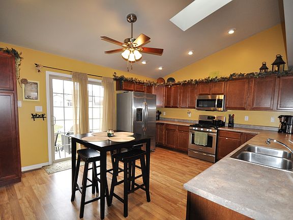 BEAUTIFUL RANCH DUPLEX WITH FULL BASEMENT. Not many of these units have Basements. Large Living room with Vaulted Ceiling & Fan, Open Concept to Eat in Kitchen with Abundance of Cabinets, Vaulted Ceiling, Skylight & Recessed Lighting. All Appliances Stay! Off Kitchen is Sliding Patio doors to Patio & Nice size Privacy Fenced Backyard. Main Bedroom offers Walk in closet & Private 3/4 Bath. 2nd Bedroom is also nice nice with Walk in Closet. Finished Laundry room with Laundry sink & Ceramic flooring. Finished 2 Car Garage. EXTRA BONUS IS THE FULL BASEMENT which has a Egress window. Low Taxes! Located in St John Township with Lake Central Schools & Just minutes to the Erie Lakawana Bike Trail. GREAT PLACE TO CALL HOME!:)