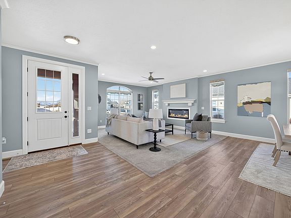Welcome home! Designed with open concepts and main floor living, this lovely home is clean and inviting. 9-foot ceilings enhance a living room with cozy fireplace, dining area and beautiful kitchen with island making the space ideal for gatherings and entertaining. The master bedroom features a walk-in closet, private bath with walk-in shower and abundant space. Two other bedrooms on the main floor could double as a den or office space, with laundry and a full bathroom. The home backs up to a park with pickleball court, pavilion and playground plus offers forever unrestricted stunning mountain views! HOA includes front landscaping care and snow removal as well as common areas. A large finished family room in basement and another full bath leaves unfinished space for storage or extra bedrooms. Square footage from county records and buyer to verify all.