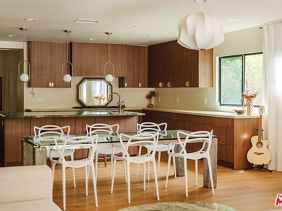 Welcome to 12220 Benmore Terrace, an artfully updated mid-century home situated north of Sunset at the end of a long private driveway, behind gates in the lush hills of Brentwood Heights. Designed by the acclaimed architect A. Quincy Jones, this residence embodies elegance and sophistication. Spanning 4,000 sq ft, the home offers six spacious bedrooms and five luxurious bathrooms, all newly renovated with designer finishes throughout. High-end amenities, such as a La Cornue range and Sub-Zero refrigerator, enhance the gourmet kitchen, which flows into the beautifully appointed living room with accordion doors that open to a sun-drenched patio. The primary suite features a gorgeous spa bath adorned with European tiles and fixtures. A large second bedroom with its own bath and a third en-suite bedroom complete the upper level. Downstairs, you'll find a separate three-bedroom, two-bath wing with its own family room and kitchenette, opening to the verdant yard and deck, surrounded by mature, lush gardens. The property can be delivered furnished or partially furnished. Parking for 4 cars comes with an electric car charger, while solar panels provide ample power to dramatically reduce the electric bill. Nestled on a sprawling quarter-acre lot, this secluded oasis presents a unique opportunity for someone seeking complete privacy and tranquility in a convenient Brentwood location, just minutes from schools, shops, and restaurants.