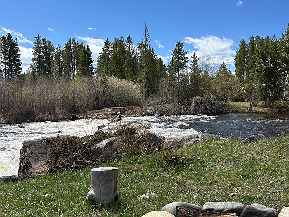 Sits on 6 acres surrounded by river, floor-to-ceiling rock fireplace (wood); easy access, regular plowing incl. ONLY Available until May 15, 2025.