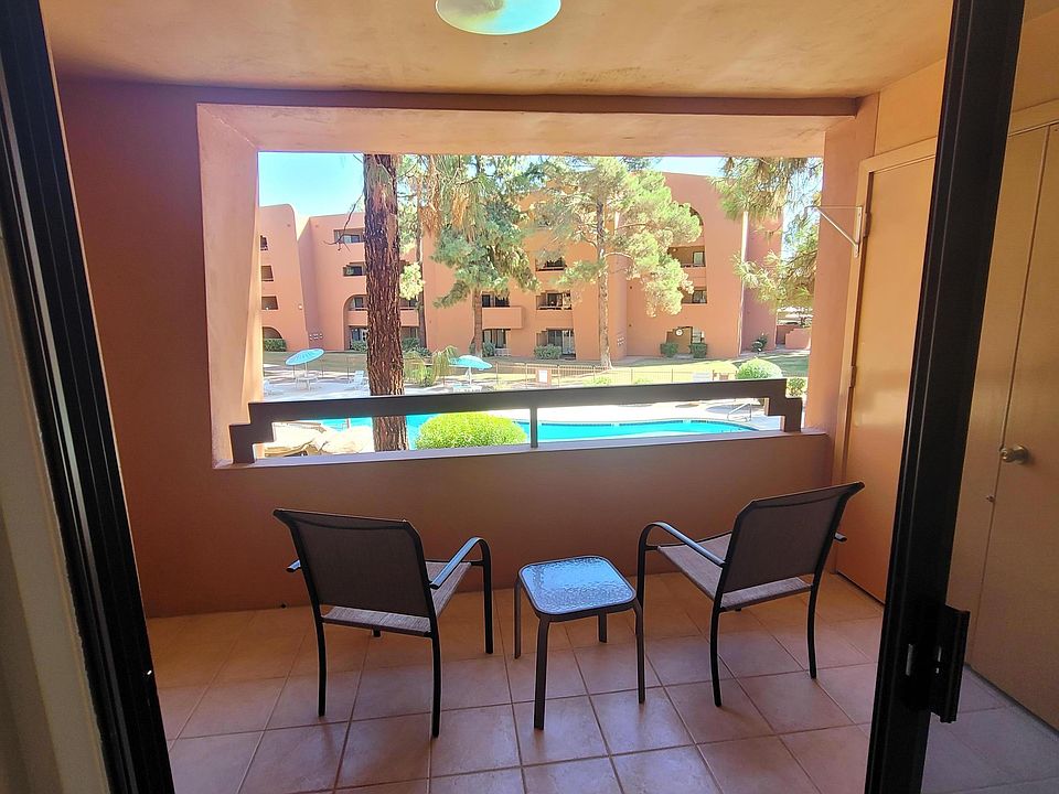 Resort style living. Come and see this gorgeous one bedroom, pool-view condo in Anasazi Village. This unit is also in close proximity to the community clubhouse which includes an exercise room, billiards, table tennis, and an event space. It has an updated kitchen with maple cabinets, granite countertops and stainless-steel appliances. The bathroom also has updated granite counters, maple wood cabinetry, dual sinks and modern lighting fixtures. The bedroom has beautiful laminate flooring and plenty of storage space as it provides 3 closets (one of them a walk-in)! Ceramic tile flooring throughout the remainder of the home. Enjoy your morning coffee in the