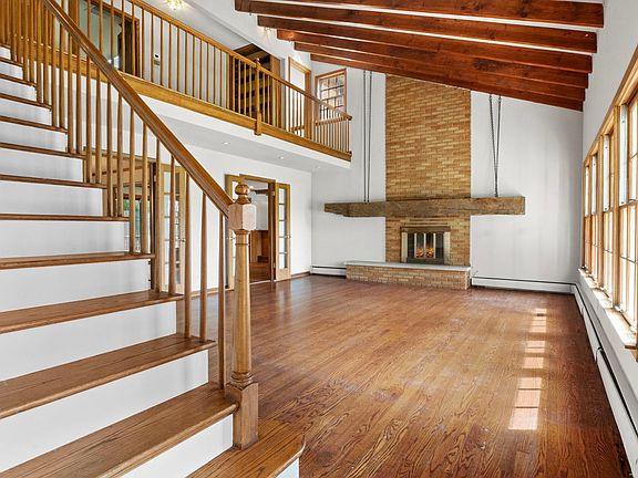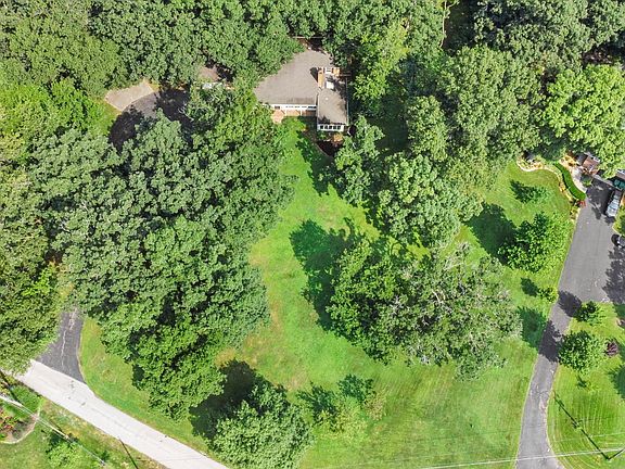 Serene, tranquil, and quiet perfectly describe this rare find. Located on a peaceful road, this 4-bedroom, 2.5-bathroom home sits on 1.37 acres surrounded by mature trees and lush greenery-offering total privacy with no neighbors behind you. Inside, the family room features vaulted, beamed ceilings and a charming brick wood-burning fireplace. A four-seasons game room and a built-in bar lead out to an oversized deck nestled in the woods-ideal for relaxing or entertaining. The kitchen is equipped with corian countertops, a breakfast bar, and a panel-front refrigerator for a seamless look. Outside, the loop driveway includes an additional concrete pad for extra parking while the garage is 2 cars it does have a back overhead garage door with a workshop area or the perfect place to store your lawn equipment without jeopardizing your car spaces. A truly unique property that blends nature, comfort, and privacy-don't miss this rare opportunity. New Boiler and Water Heater 2025, Well, Water Softener, A/C 5/7 years old. Also available for purchase is 3.27 acres behind the home- zoned R2 seller purchased to provide complete privacy!