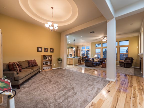 RARE IMMACULATE ranch home with 4 car garage! This beauty is your dream come true: 11ft ceilings, backs to open space, large professionally landscaped lot, with unobstructed mountain views! Main level boast an abundance of 5" Hickory solid wood floors. Main floor Master has 5 piece w/ jetted tub. Master walk in closet (Cedar lined California Closet) w/ access door to laundry for your convenience. 1 additional bedroom and full bath on the main, and office w/ french doors and custom built in bookshelves. Gourmet kitchen has large eat up island, numerous cabinets, high end SS appliances, level 5 granite, and eat in area w/ access to deck. Great room w fireplace, and dining room. Exterior was designed with outdoor entertainment in mind: large trex deck, steps to large stamped custom patio with gas fire pit and built in bench. LL: 3 add'l bedrooms, 2 full baths, family/theater room w/ surround (screen/proj stay), and bar area. Central vacuum, concrete window wells, planation shutters.