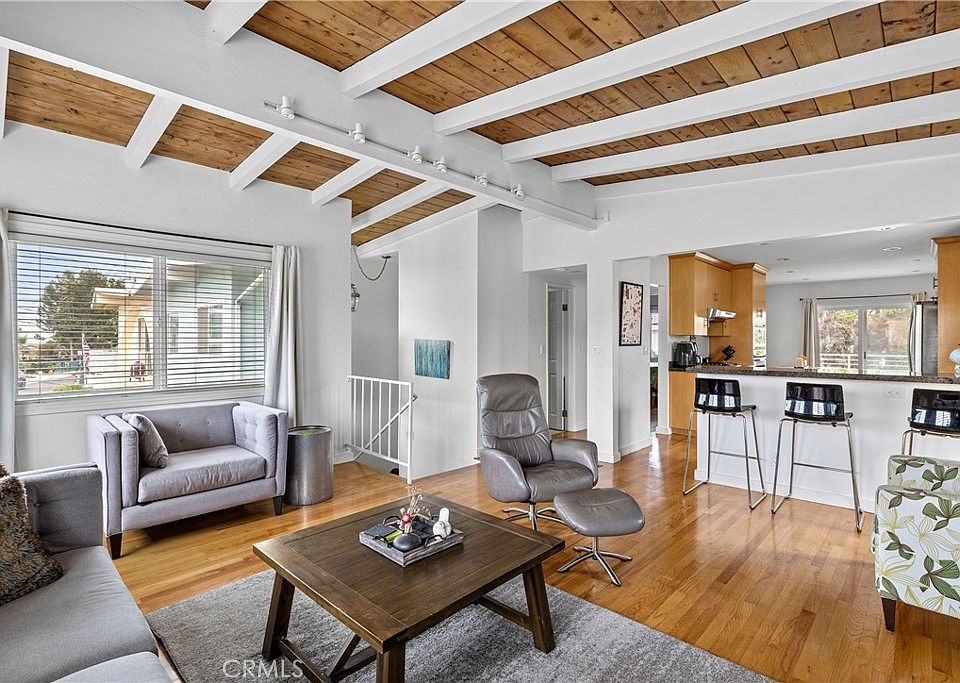 Tucked away on a peaceful two-block street in the coveted Hermosa Hills, this tastefully remodeled 3-bedroom, 2-bathroom home blends coastal charm with modern comfort. Step inside and head upstairs to the open, sun-filled living area, where soaring open-beam wood ceilings and newer vinyl windows create an airy, inviting vibe. The remodeled kitchen is a showstopper—featuring stainless steel appliances, a built-in microwave, a 5-burner stovetop, and lighter wood soft-close cabinetry perfect for both preparing everyday meals and entertaining. Off the kitchen, a sliding glass door leads to a composite deck—perfect for taking in the twinkling city lights or heading straight down to the private backyard for relaxing or recreation. The extra-wide lot provides room for both. The upper level also includes a bedroom and a sleek hall bath with a generous walk-in shower. Downstairs, you’ll find two more bedrooms and a shared bathroom, plus direct access to the serene backyard through sliding glass doors. Whether you step out from the lower level or head down from the deck, the private rear yard is yours to enjoy from both floors of the home. Practical perks? Fresh interior paint, recessed lighting, wood floors, updated windows and a two-car garage with direct entry. All this just blocks from Hermosa Beach’s vibrant dining and shopping scene, an easy bike ride to the sand, and right around the corner from the newly upgraded Hermosa View School and Sea View Park and playground.