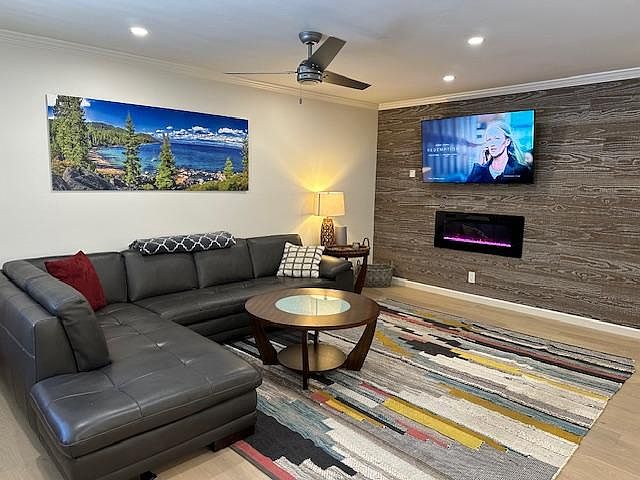 Open concept living room, kitchen, and dining area give this home a spacious feel. Decorative wood wall in the living room with built-in fireplace and smart TV.