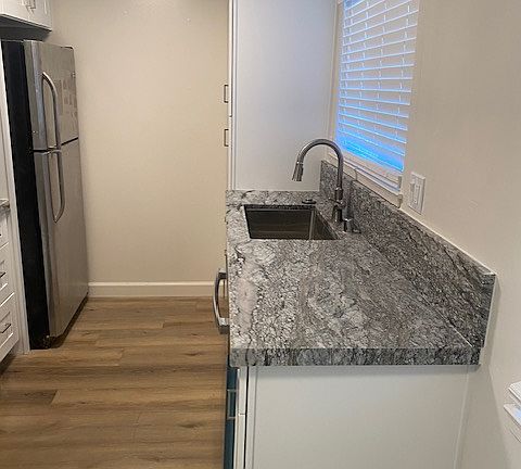 Large, remodeled one bedroom, one bath apartment in north Sunnyvale conveniently located close to Highway 85. New laminate flooring throughout the unit, along with new kitchen cabinets, granite counters, appliances, and recessed lighting. Remodeled bathroom, including tiled stall shower and new vanity with granite counter. One on-site carport parking space and storage locker. $2,550 per month. Call, text, or email Linda.