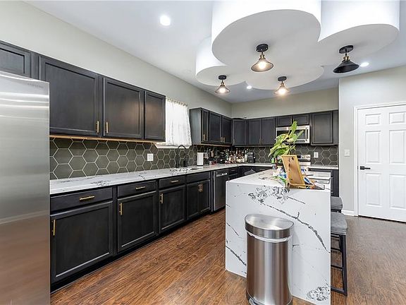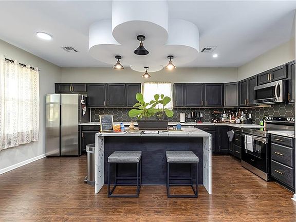This three year old home offers a blend of modern design and timeless finishes with upgrades throughout. The seller relocated for work sooner than expected and was sad to leave this thoughtfully designed home behind. The open layout welcomes you with luxury wood laminate flooring that flows through the main living spaces, paired with sleek tile in the wet areas. The living room features a dramatic accent wall and oversized ceiling fan that create both comfort and architectural character. The kitchen is a true showpiece with striking dark cabinetry, custom tile backsplash, waterfall edge granite island, and top of the line Samsung appliances including a counter depth refrigerator. Designer lighting and fixtures add a touch of elegance while expansive counter space and storage provide everyday practicality.