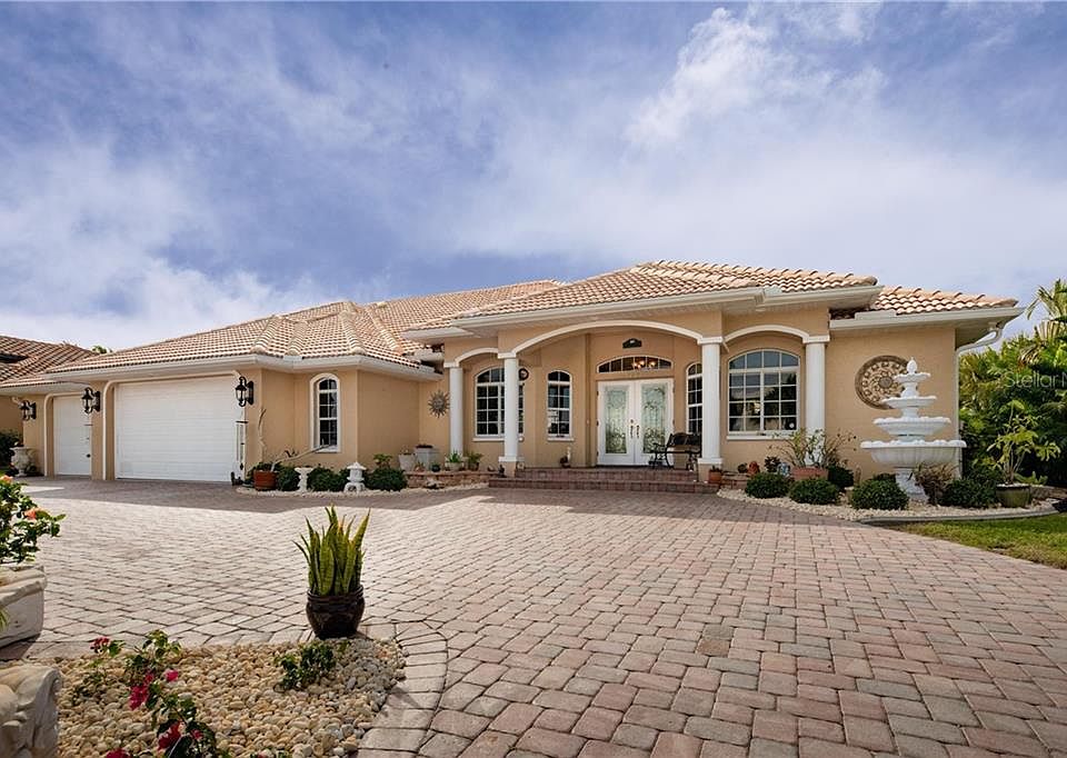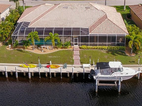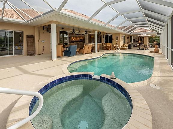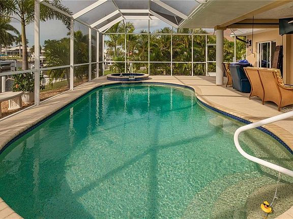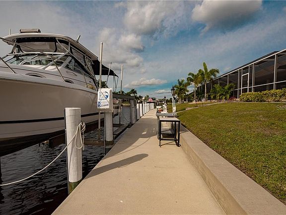 BACK ON MARKET! PREVIOUS CONTRACT WAS CONTINGENT UPON SALE OF BUYERS' HOME! This unique custom-built home is on an oversized lot in the eastern Powerboat section of PGI, a 15+ minute cruise to Fishermen's Village. The open Great Room/Kitchen/Dining/Dinette floor plan with soaring ceiling and porcelain tile opens via pocketing sliding doors to the 1900 sq ft Lanai and Deck with a heated Saltwater Pool and Spa that is also accessible from 2 of the bedrooms, the den and a bath. The Kitchen features a wrap around breakfast bar with seating for up to 8, a gas range and newer stainless appliances. The Owners' Suite, added in 2007, offers not only a great canal view and pool access but also boasts a world class Bath with onyx counters, a multi-head electronic shower control system, and travertine flooring. Did we mention the abundance of storage space, the walk-in pantry, crown molding, custom fixtures and other pocketing sliding doors? How about the 3.5 car attached garage and circular pavered driveway? The water side of this great home features 115' of city maintained concrete sea wall with a 109' dock, complete with both electric (30A) and water. From this location, shopping and downtown Punta Gorda are less than 2 miles away. Punta Gorda airport is less than 20 minutes and SW FL International just a short 40 minutes. Great location and an unbelievable lifestyle! Check out the features sheet and images/virtual tour for a walk thru of this beautiful home and make an appointment to see it today!