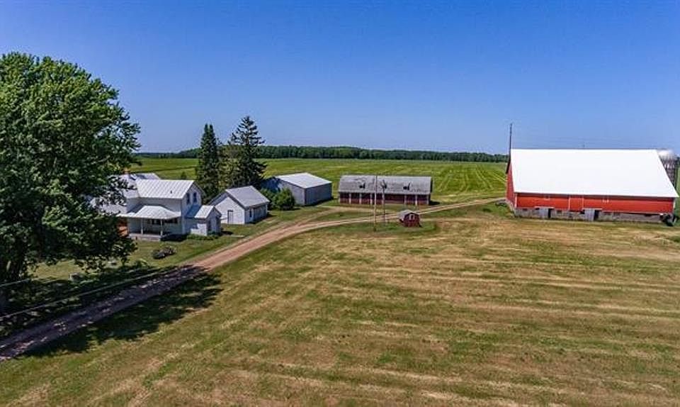 10 acres. Nicely updated farm house. Updates include: new windows, water heater, refreshed kitchen-painted cupboards and new flooring, new front porch and lots of things freshened up through out. 4 out buildings; dairy barn, pole barn, machine shed and garage.