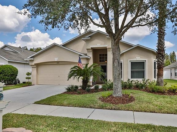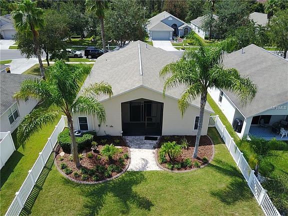 DESIRABLE GATED COMMUNITY OF MEADOW POINTE HOME WITH WATER VIEWS!! This home is located on a oversized conservation/POND lot with a huge fenced in back yard. No rear neighbors!! Open floor plan with cathedral ceilings, wood floors, eat in kitchen with ceramic tile and breakfast bar, formal dinning room just off the kitchen. Master bedroom has vaulted ceiling with sliding door access to the covered rear lanai, master bathroom has a garden tub and tile shower! Plenty of room in the walk in closet. There are 4 bedrooms and 3 bathrooms. BRAND NEW Heating and Cooling system installed in 2017, Brand New Hot water heater installed in 2016. The windows have been updated with newer windows. HUGE fenced in backyard!! The community pool and clubhouse is a short distance away as well as all the shopping at The Shops At Wiregrass.