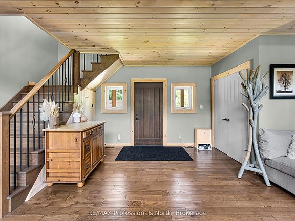 Welcome to your dream country retreat, where nature and luxury meet, just a short 10-minute drive to all the amenities of Bracebridge. This custom-built, two-storey home offers timeless appeal with striking Post & Beam accents, and exceptional craftsmanship throughout. This private and tranquil oasis has established trails throughout the mixed forest ideal for exploring the level and landscaped 9.9 acre parcel of land. Step inside and be captivated by the exquisite soaring two-storey stone wood-burning fireplace in Living Room showcased by solid red oak flooring milled from trees grown right on the property - truly a one-of-a-kind detail! Designed for families and professionals alike, the home features four spacious bedrooms, with main floor Primary Suite, complete with walk in closed and 5 piece ensuite, a massive home office, and 3 additional beautifully appointed bedrooms. Large banks of floor to ceiling windows flood the home with natural light and bring the outdoors in with all principal rooms commanding exceptional vistas. The open concept main floor is ideal for entertaining family and friends with the kitchen boasting ample cupboard space, additional pantry and 4 burner propane stove that will impress any home chef. Enjoy the numerous walk outs to multiple cedar decks which are ideal spaces to continue your entertaining, outdoor living or quiet times by the fire pit. This beautiful acreage offers gorgeous granite outcroppings, a variety of mixed bush and a calmness that will help you unwind from the most hectic of days. Added features include a Generac link on the hydro meter ensuring you're ready for any power outages, ICF foundation, spray foam insulation interior and exterior walls. Lets not forget the garage/workshop with approx. 12-foot ceilings, radiant in-floor heating, and drywall finish, this space is as functional as it is comfortable for year-round use Don't miss out on this exceptional house - truly a house for all seasons.