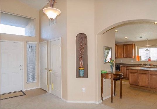 Home for Sale in Northern Meadows: 1224 Sidewinder Road, NE Rio Rancho, NM 87144 3 Bedroom, 2 Bath, Office, 2 Living areas with 2,215 s.f. REDUCED to $220,900 Grand entrance, unique in detail with niches, arches, & high ceilings. Light filled, airy living room with French doors. NEW: GRANITE COUNTERTOPS, GLASS TILE BACKSPLASH, DEEP BASIN SINK, GARBAGE DISPOSAL, FAUCET, WHIRLPOOL STAINLESS STEEL APPLIANCES, & LIGHT FIXTURE. Huge pantry plus extra storage with nearby laundry room. Family room has stacked stone gas log fireplace. Back yard has raised garden and covered patio. 505-610-8254
