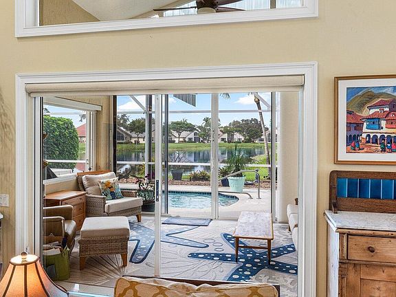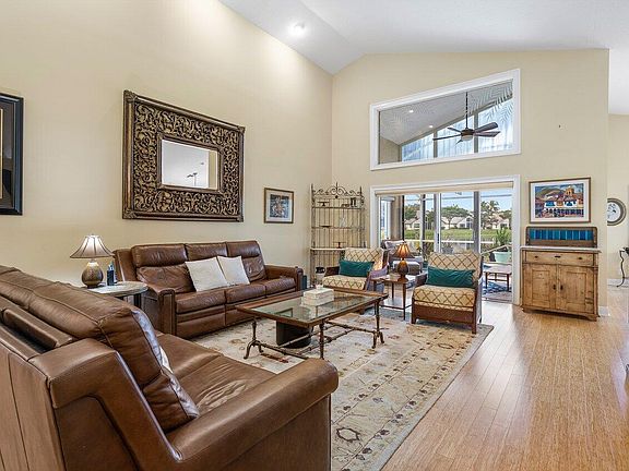 Lakeridge Greens offers a luxurious single-family home lifestyle. Resort-style amenities including a bustling clubhouse with pickleball, state-of-the-art fitness center, tennis courts, sparkling pool, and top shows. Manned guard gate and lush landscaping throughout. Stunning 3-bed , 2-bath home is a true entertainer's dream. Soaring ceilings and extended glass-enclosed lanai seamlessly blend indoor and outdoor living, opening to a private saltwater pool and breathtaking lake views. Remodeled kitchen and open-concept living space with bamboo flooring, are perfect for hosting friends and family. Master suite is spacious with glass doors to pool, large walk-in closet, remodeled master bath with dual sinks. Generator ready with generator to run A/C, fridge and lights.