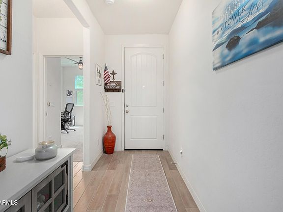 Beautiful and spacious single level home in gated community. APS ENERGY STAR Certified Home with highly efficient 16 SEER A/C. Stunning mountain views. Professional and enthusiast cooks will love the gas stainless steel kitchen. Extended kitchen island with seating is a perfect gathering place for the family. Upgraded modern 42'' white cabinets. Upgraded 6x36 tile throughout, carpet in bedrooms. Open and bright great room is very welcoming and ideal for entertaining. Split plan with Owner's Suite away from the other bedrooms, giving owners a lot of privacy and a place to relax away from the rest of the home. Beautiful barn door in primary suite. Great curb appeal with a paver driveway! Must see this home.