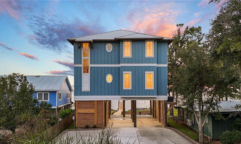 New Gold Fortified Bayfront Home – 3BR / 3BA – 2,600 sq ft. Built in 2025, this raised beach home designed by Bob Chatham blends elegance, durability, and breathtaking Mobile Bay views. Featuring a metal roof, hurricane-impact Marvin windows/doors, and an elevator to all floors, this home is built to last. The open floor plan highlights a large living area and chef’s kitchen with 60 inch Thermador refrigerator/freezer, Bertazzoni 6-burner gas stove, dual fuel Bertazzoni range, dishwasher, farmhouse sink, large island with seating, walk-in pantry, and Taj Mahal quartzite countertops with custom cabinetry. The upper-level primary suite offers bay views, two walk-in closets with pass-through to the laundry room, private balcony, and wet bar with dual-zone wine/beverage cooler. The spa-like primary bath includes a freestanding tub, dual vanities, walk-in shower, water closet, and large linen closet. Upstairs bedrooms also include en suite baths and walk-in closets. White oak flooring flows throughout, while outdoor living is enhanced by a pier and boathouse built by Quality Dock & Seawall. This Gold Fortified home offers unmatched craftsmanship and the ultimate Mobile Bay lifestyle. Buyer to verify all information during due diligence.