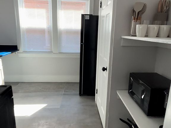 The fully stocked kitchen makes settling in easy, whether you're cooking every night or just making coffee on the Keurig. You'll find pots, pans, dishes, and everything else you need to get started. It has plenty of cabinet space, so you won't feel cramped or cluttered. Outside, the large front porch offers a spot to hang out or just enjoy some fresh air, and there's a private backyard parking pad so you won't have to search for street parking. Entry is through a short flight of stairs that leads directly to your front door.