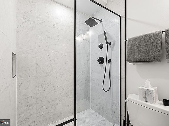 The bedroom easily fits a queen bed, looks onto the patio, and includes a generous closet beside a stacked Samsung washer-dryer. A nearby bath features marble tile, a frameless glass shower with rainfall head and handheld wand, and matte-black fixtures for a spa-like feel. Zoned mini-split HVAC keeps each room comfortable year-round, while a gated entry add peace of mind