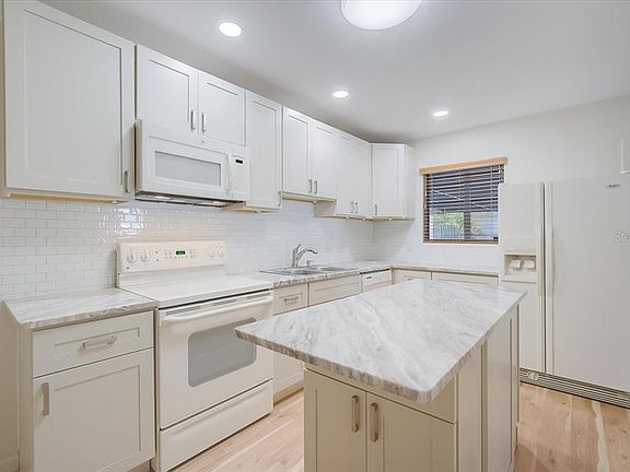 One or more photo(s) has been virtually staged. Renovated Triplex close to the Central Cocoanut Historic District and downtown Sarasota! This 2-bedroom unit is a spacious with 1 bathroom and a rear screened patio. The large living room features a decorative fireplace, a large picture window, and modern lighting. A new modern kitchen with stone countertops, custom cabinetry, matching appliances, and an island with lots of storage makes cooking and entertaining easy. There are two large bedrooms with ample closet space and a bath with dual sinks, solid surface countertops, walk-in shower, and built-in storage. This unit has its own carport and a private laundry/utility room with included washer/dryer and extra sink. Other features include upgraded lighting, ceiling fans, vinyl flooring, hurricane impact windows and wood blinds. Don't miss this opportunity to live near all that Sarasota has to offer with a 5-minute walk to downtown and short drive to St. Armand's Circle, Lido Beach and tons of restaurants, shopping and entertainment. Water/sewer, pest control, trash collection and grounds maintenance is include in rent. One adult dog under 60 lbs is permitted with a refundable $300 pet deposit. No aggressive breed dogs allowed. No puppies allowed. Advanced rent (last months rent) is being waived for qualified tenants.