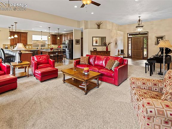Welcome to luxury living in the exclusive Wildernest community! This pristine, like-new home offers 2,644 square feet of exquisite living space, featuring 3 bedrooms, 3 baths, and a 3-car garage, all nestled on a meticulously landscaped half-acre lot. As you step inside, a grand foyer leads you into the spacious living, kitchen, and dining great room, where comfort and elegance blend seamlessly. The living room, boasting 11-foot ceilings and plush carpet flooring, invites relaxation with a 2-sided gas fireplace and panoramic windows offering stunning views of the backyard and the historic barn on the adjacent property. Adjacent to the living area, the expansive granite kitchen awaits, boasting a large work island, gas cooktop, double oven, 3-door refrigerator, and a generous walk-in pantry. The adjacent dining area, with wood floors and panoramic windows showcasing views of Pikes Peak, offers a charming space for gatherings and meals. Retreat to the luxurious master suite, featuring a spacious bedroom with 10-foot ceilings, carpet flooring, panoramic windows, and direct access to the patio. The en-suite master bath pampers with dual vanities, a soaker tub, a separate shower, and a walk-in closet. Guests will be pampered with a private powder room. Two additional bedrooms, each with carpet flooring and walk-in closets, offer comfort and privacy for family or guests. A shared full bath with dual vanities and a ceramic over tub & shower completes the accommodations. Outside, the well-landscaped front and rear yards provide a picturesque backdrop for outdoor enjoyment. Relax on the deck and take in the breathtaking views of Pikes Peak and stunning sunrises, while observing the abundant wildlife that frequents the area. Conveniently located within walking distance to schools and close to shopping, Meadow Woods Sports Complex, and an array of outdoor recreational activities including hiking, biking, and fishing, this home offers the epitome of Colorado living.