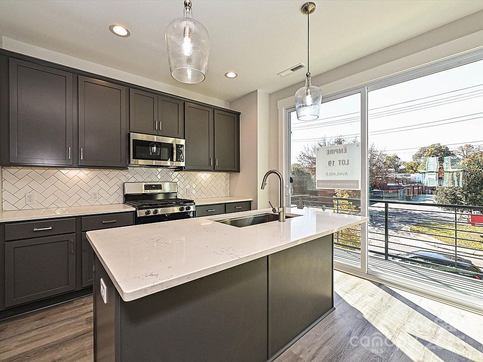 4-story townhome walking distance to restaurants in NoDa. 2-car tandem garage & driveway for additional parking, plus all kitchen & laundry appliances included. Easily entertain in the 4th floor rec room w/ powder & rooftop terrace! Kitchen features 42" dark grey painted cabs, quartz counters, LED under-cabinet lights, large undermount SS sink, & GE SS app w/ gas range & fridge. Small deck off the kitchen offers additional outdoor space. Both outdoor spaces have TREX decking. Laundry is located w/ the 2 bedrooms on the 3rd floor; a stacked washer/dryer is included. Private Premier Bath has light grey painted cabs, quartz counters, tiled floor, & a tiled shower. Guest bath features dark grey cabs, quartz counter, tiled floor. LVP flooring is throughout the 1st and 2nd floors plus 3rd floor hall, with oak treads on all stairs. 9' ceilings throughout.