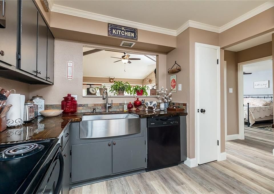 Adorable, remodeled, spacious, super clean with an open concept, 2-bedroom, 2-bath, 2-living areas, with covered parking Townhome! Stove, dishwasher, microwave, wood-look laminate floors, French patio doors all about a year old. AC, water heater, electrical panel, & gutters are about 3 years old. Spacious living room with vaulted ceilings opens to the newly remodeled kitchen with beautiful stained wood countertops and a farm sink. The extra living space has remodeled cabinets with lots of storage space. Also, an enclosed cozy patio and a 12 X 5 storage shed. The townhome is just across from the golf course by the 4th tee box and in front of a small park which provides extra parking across the street. No HOA!