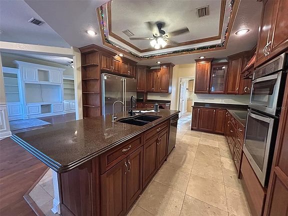 Beautiful & spacious 4-bedroom, 3-bath residence featuring a gourmet kitchen with custom-built solid wood cabinetry and an oversized refrigerator. The living and dining areas include built-in features for functionality and style. Separate office or den off the living room. Solid wood flooring extends throughout the home. An additional lot next door provides ample space for camper or boat storage. A storage shed is also available on-site. This one is sure to go fast! Call to schedule a showing today!