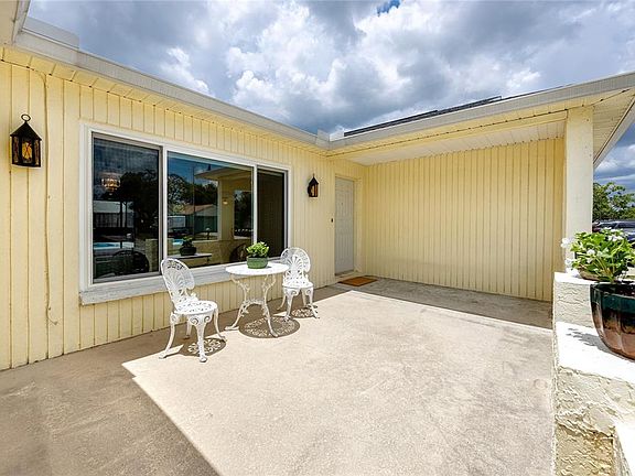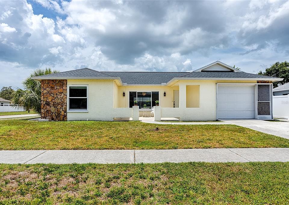 This lovely POOL HOME has NO HOA, NO CDD and is in a NO FLOOD ZONE. It's in the charming Holiday Lakes West neighborhood and blocks away from the Elementary, Middle and High Schools. All the the major ticket items have been updated within the last 5-6 years. The home boasts of a dimensional shingle roof (5 years old), hurricane rated windows(have a lifetime warranty), AC System (5 years old mol), water heater (new), water softener (six years old mol), reverse osmosis, disposal, Bosch dishwasher, pool has been resurfaced and the cool deck around the pool and back patio (new with 4 year guarantee). The home has painted inside and out and is light and bright. The kitchen has plenty of countertop space and a breakfast bar. The kitchen opens to the dining and family room. There is a sliding glass door from the family room to enjoy the pool view and is perfect for entertaining. The living room is spacious and can also be used as a combination formal living and dining area. There are two nice sized bedrooms with plenty of closet space. The primary bedroom has a sliding glass door that provides a private entrance to the pool area. There are plenty of closets for extra storage and the garage is an oversized for one car with extra room to add shelving for storage. The cool deck around the sparkling pool extends to the open patio where there is room to grill. The home is on a corner lot and the yard is fenced for privacy. The location is fantastic as it is a mile from Anclote River Park, the bike/walking trail, the public boat ramp, 3 miles from Tarpon Springs Sponge Docks.