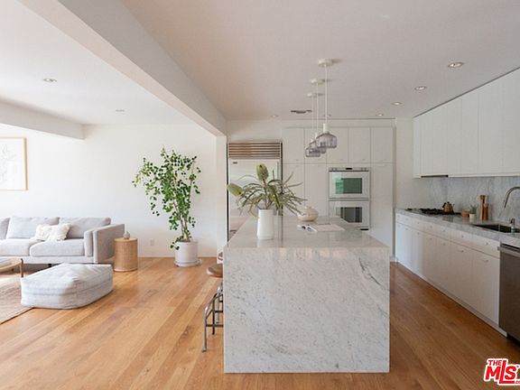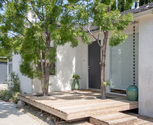 2 bedroom / 2 bathroom + detached office on a quiet tree-lined street close to LACMA, Carthay, Miracle Mile and the Farmer's Market. This sunny remodeled residence comes with an abundance of windows and French doors, newly re-finished hardwood and bright white tile flooring, and an open modern kitchen with Carrara marble countertops and fresh new cabinetry. The great room of kitchen, living, dining includes a fireplace nook and built-in entertainment center and bar. A breezeway with glass wall leads to the guest bedroom / bath and laundry room. The master has a very large walk-in closet and airy full bath. Outside, multiple wooden decks give a beachy vibe and the 2-car garage has been converted to a storage unit and office with built-in desk and bookshelves. The property is securely gated with Japanese garden and mature privacy hedge at front, and grassy yard at back. How could Summer be better than this?
