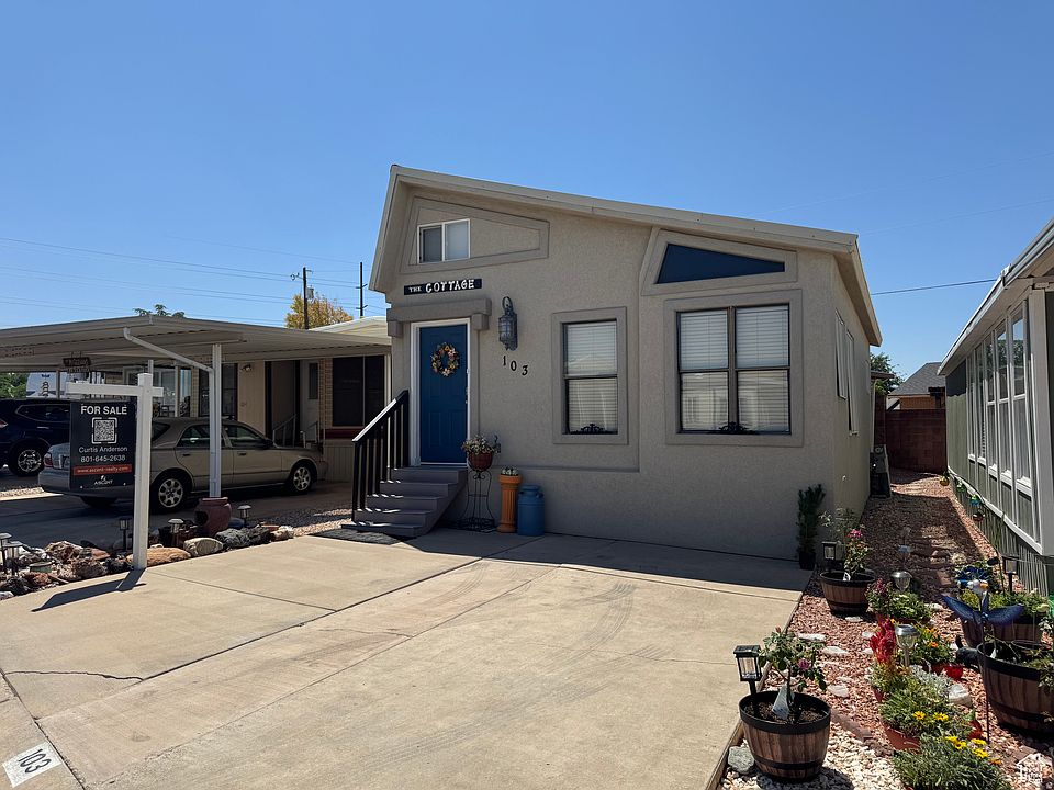 Welcome to The Cottage - a charming and well-maintained home in the desirable 55+ community at 1225 N Dixie Downs Rd in St. George. This cozy two-bedroom, one-bath home offers an all-stucco exterior and a unique loft addition with approximately 267 sq. ft. of extra sleeping or flexible space. Inside, you'll find an updated kitchen with stainless steel appliances, a new shower surround, and an HVAC system replaced about 8 years ago. A rare highlight is the backyard shed with full utility hookups, providing valuable storage and workspace not available in many units. Residents of this welcoming community enjoy access to a clubhouse, pool, and hot tub, making The Cottage perfect for year-round or seasonal living. Square footage figures are provided as a courtesy estimate and taken from appraiser measurements . Buyer is advised to obtain an independent measurement.