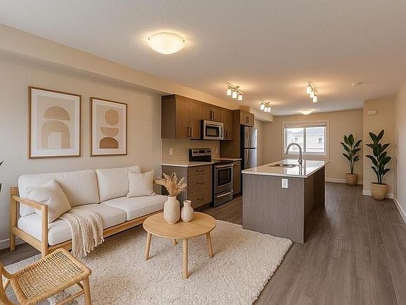 Welcome to this turn-key, move-in ready condo located in the desirable community of King’s Heights in Airdrie. Designed with style and function in mind, the modern centre kitchen is a true highlight featuring quartz countertops, a large eat-up island, stainless steel appliances, an upgraded refrigerator, pendant lighting, and wood-grain laminate flooring throughout the main level. The open-concept design is bright and inviting with large windows that flood the space with natural light, while the back deck provides the perfect setting for summer barbecues or quiet evenings outdoors. Upstairs you’ll find the convenience of upper-floor laundry along with two spacious primary suites, each offering a walk-in closet and its own four-piece ensuite bathroom. The attached garage adds everyday convenience with a walk-out to a private concrete patio and outdoor space. Set in King’s Heights, this home offers the perfect balance of comfort and location, with easy access to parks, pathways, schools, shopping, dining, and commuter routes. Don’t miss this opportunity to own in one of Airdrie’s most sought-after communities!
