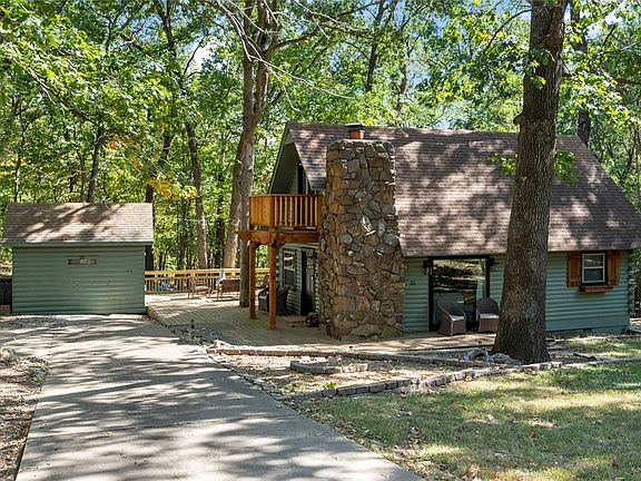 This stunning cabin located on Monkey Island at Grand Lake has the perfect mix of modern elegance and rustic charm, with tasteful updates throughout while leaving the character from the wood beams on the ceiling, log focal walls in the living room and bedrooms, and a stone fireplace that leaves a lasting impression! This cabin is the perfect place to relax and get a break from city life, nestled into the woods with a stunning view of trees while being within walking distance to the lake and the H2O Marina with boat ramp, making it perfect for all your watercraft needs and near the beautiful Battlefield Par 3 golf course. This cabin is also just a short drive to Shangri-La for a day on the golf course, plenty of restaurants, a spa, games, and so much more. The location can't be beat! Step inside and feel the serenity that the first floor has to offer with peaceful colors, stunning large windows that bring nature inside, a cozy living room perfect for chilly nights around the fire, and a kitchen that stuns with beautiful granite countertops, floating shelves for additional storage or decor and provides the perfect amount of space to whip up your favorite dishes this summer! This cabin has 3 spacious bedrooms, the primary being on the ground floor, providing privacy from the rest of the home, which offers plenty of room for your family or friends to come and enjoy everything Grand Lake has to offer. One of the upstairs bedrooms also has a walk-out onto a lovely balcony that puts you front and center in the trees that surround this stunning lot. Two full bathrooms give plenty of space and privacy while being tastefully remodeled and designed. Out back, you will find a large wrap-around deck with multiple areas for seating and entertaining, as well as a firepit perfect for roasting marshmallows or relaxing in the evenings with your loved ones. There is also a large shed for a golf cart. This cabin on Monkey Island is a hidden gem able to double as a short-term rental!
