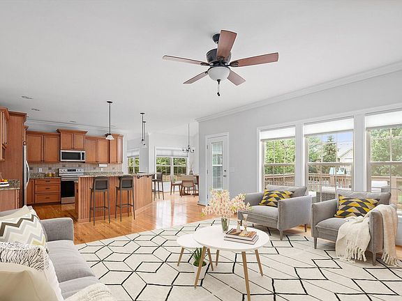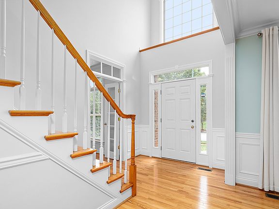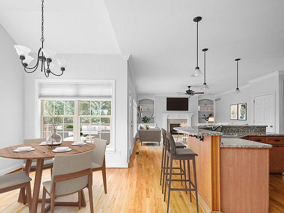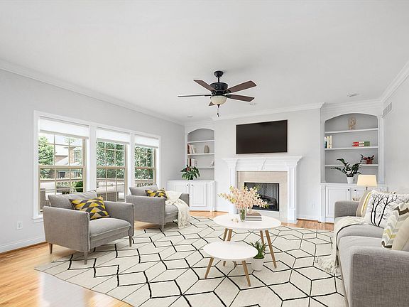 The gourmet kitchen offers plentiful cabinetry, a raised bar island with seating for up to six, a built-in desk, and a pantry. It flows seamlessly into the family room with a cozy fireplace and custom built-ins. The formal living room, featuring French doors, and the formal dining room are positioned on either side of the central hall staircase.