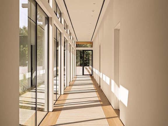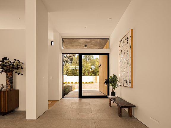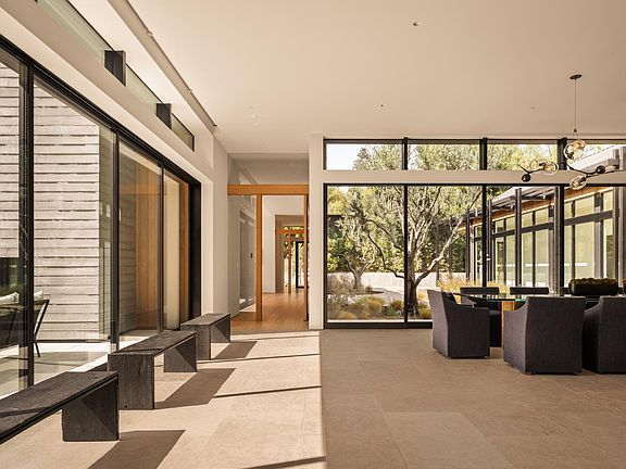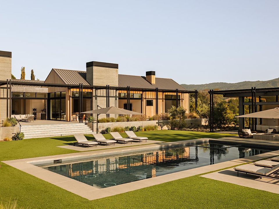 Sited on over 2.2 flat acres in prime Ojai Valley, The Shippee Estate is a rare opportunity to own a newly constructed architectural farmhouse compound featuring the highest level of finish and design in a uniquely serene setting. A product of 4 years of meticulous design and building by one of the country's most prolific builders, the estate features single-story living throughout its Main Residence, Guesthouses, Cabanas, and Workshops. This private retreat features 12-20ft ceilings, walls of glass, and grand scale, perfect for entertaining, hosting, and living on all scales. The grand entry features a 12ft pivot door guiding you into an open-concept living space, with soaring ceilings and walls of glass that frame the surrounding landscape and zen-inspired courtyard featuring olive trees and native landscaping. Natural light floods the interiors, creating a seamless transition from the large public spaces to the grounds and outdoor spaces beyond. Premium materials and finishes are showcased throughout, including wide-plank white oak flooring, sandblasted limestone, imported Calacatta marble, and a chef's kitchen outfitted with professional-grade Miele, Wolf and Subzero appliances. The exterior is clad in warm cedar siding, enhancing the home's architectural character and blending seamlessly with the natural surroundings. Lighting and fixtures sourced from renowned designers Apparatus and Rejuvenation further elevate the home's modern elegance. Every element reflects a commitment to quality and craftsmanship, resulting in a residence that is both timeless and enduring. Interior features of the Main Residence include a resort-style primary suite, boutique-inspired walk-in closet, and spa-like bathroom with an additional private outdoor shower and garden. A secondary primary suite features soaring ceilings, cozy fireplace, and a sublime bathroom with soaking tub and rainfall shower. Guest bedroom suites are complete with custom millwork, en-suite bathrooms, and serve as the perfect retreat for family and friends. Perfect for generational living or as the quintessential weekend retreat, this is a true compound, featuring a variety of auxiliary structures such as a pool cabana, entertainment pavilion with indoor-outdoor kitchen, guest house, expansive studio space and additional detached garages. Primed for any car enthusiast, the home features finished garage spaces with the height to support lift systems for additional vehicles. Outdoor amenities include various gardens, spacious patios, outdoor kitchen, turfed lawn, a resort-style pool and spa, and landscaped grounds. The property's flat acreage offers versatile potential, while its elevated position ensures year-round views of Ojai's iconic mountain backdrop. Located minutes from downtown Ojai, proximity to hiking trails, renowned dining and boutiques, and The Ojai Valley Inn. A refined retreat offering the ultimate in resort-style living in one of the West Coast's most coveted destinations.
