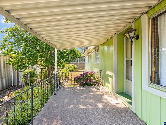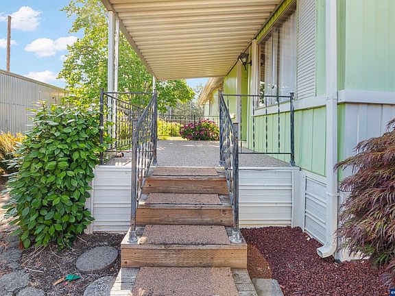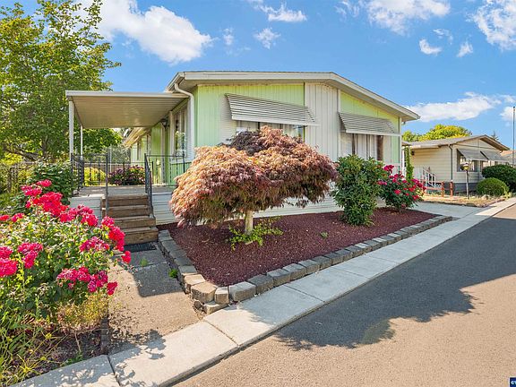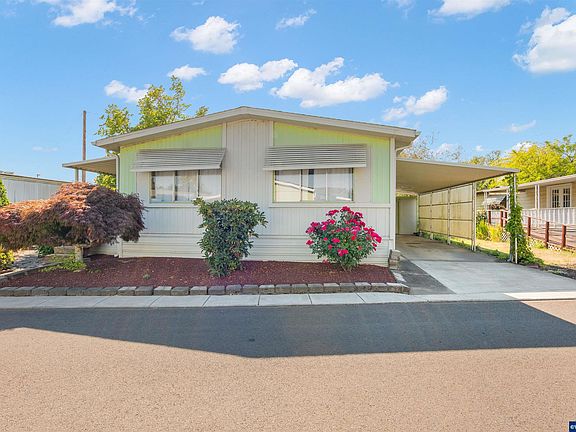 Spacious 1152 Sqft 2 bedroom 2 bathroom. Features brand new upgraded laminated flooring in the living room with built in bookcase/cabinets in the dining room. Large laundry room with sink. Outside you will find a large covered deck. Lovely fenced yard backing up to a grass field. Large covered parking and 2 storage/tool sheds. Keep cool with central Air and warm with forced heat. In Scandia Village mobile home park (a 55+ park).