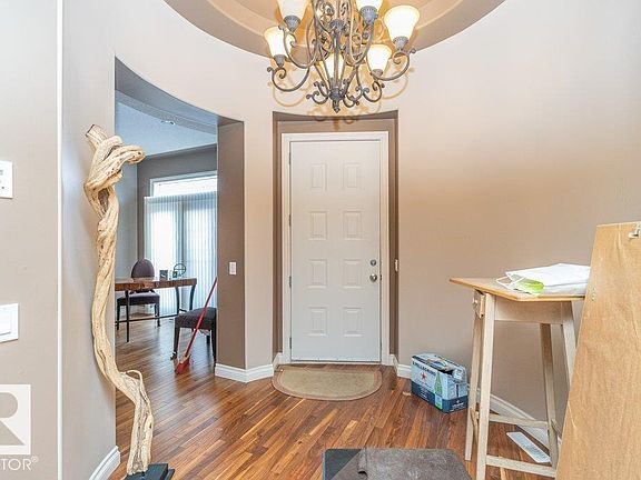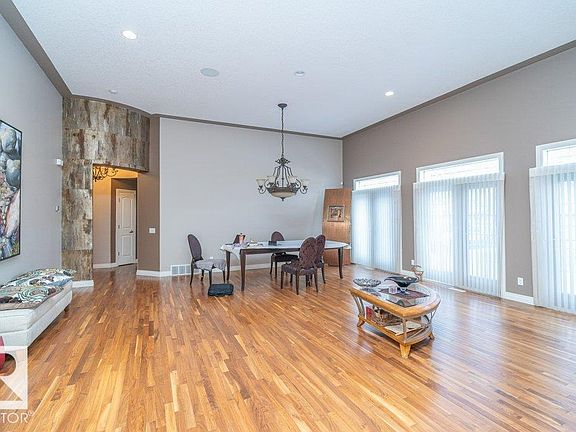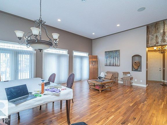 Welcome to Eagle Point at Country Club in Oleskiw, Enjoy a low-maintenance lifestyle with modern amenities in this adult-oriented gate community. This stunning bungalow features 11.5 ft soaring ceilings, a bright open-concept floor plan, and an abundance of natural light through large windows. Offering 2,087 sq. ft. on the main floor, this home includes 3 bedrooms plus a den, 2.5 bathrooms, and convenient main-floor laundry. The gourmet kitchen boasts maple cabinetry, stainless steel appliances, ample counter space, and a walk-in pantry. The dining area flows into a spacious living room with a gas fireplace, while the primary suite offers a 5-piece ensuite with a Jacuzzi and walk-in closet. The fully finished basement showcases high ceilings, a wet bar, a large recreation room, two additional bedrooms, a 3-piece bath, and a sauna for relaxation. Additional highlights include a triple heated garage, air conditioning, central vacuum system, and a water softener. Property Sold As-Is.