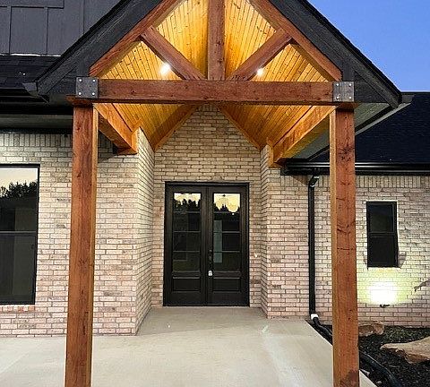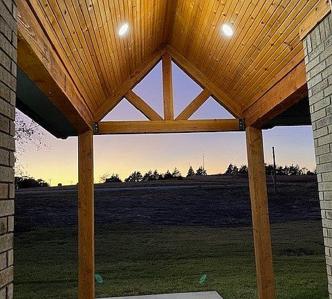 Cedar postOutdoor kitchen areaView of a pondSoaker tubCovered front porchMassive front cedar postWood detail