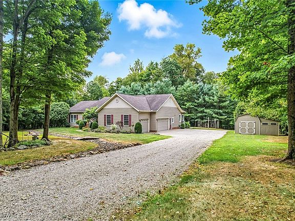 Amazing secluded ranch home built in 2003 with a 3 car attached garage, and one more garage situated on 10.4 acres! These are the original owners who custom built this house. The home features 9 foot ceilings with crown molding and recessed lighting throughout, with the added benefit of insulated interior walls. Most of the flooring, baseboards and much of the trim work are made from hardwood maple sourced from the property. The kitchen includes a breakfast bar with granite countertops, maple cabinets, under-cabinet lighting and a pantry. There's also an eating area by the kitchen as well as a formal dining room. On one side of the home you will find the master bedroom with a master bathroom featuring two separate sinks, a full shower, garden bathtub and walk-in closet. Adjacent to the master bedroom is an office which could also serve as a nursery, work out room, fourth bedroom etc. On the other side of the home there are two additional bedrooms, a full bathroom and a laundry room. The great room boasts a fireplace and a wall of windows, offering wooded views and abundant natural light. A three-season room is located off the kitchen with windows and screens. The basement is larger than the 2,248 sq ft of the main home, extending under the three-season room. It is a walkout basement with 4 double-hung windows providing natural light, currently used as an art studio. While unfinished it offers endless possibilities! There's also a wood burner in the basement tied into the heating system. Updates include new heat pump in 2019, new flooring in the 3 seasons room in 2022, new water softener in 2024, new hot water tank Sept. 2025. Outside the property is beautiful with stone trails extending over 1/4 mile into the woods, with a bridged culvert that provides tractor access to the entire wooded lot. Property includes two out buildings, one is 12x20 with windows and overhead garage door. The other outbuilding is a 12x14 utility shed with a lean-to for additional equipment.
