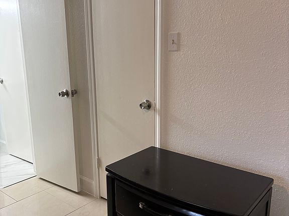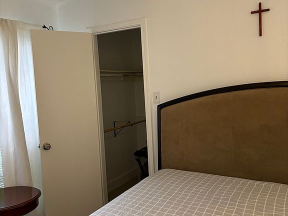 This bright and comfortable primary bedroom is located on the first floor and features tiled flooring, a ceiling fan, and a spacious closet. The room includes a large bed with built-in storage drawers and access to a newly remodeled bathroom for your convenience.