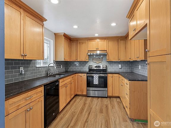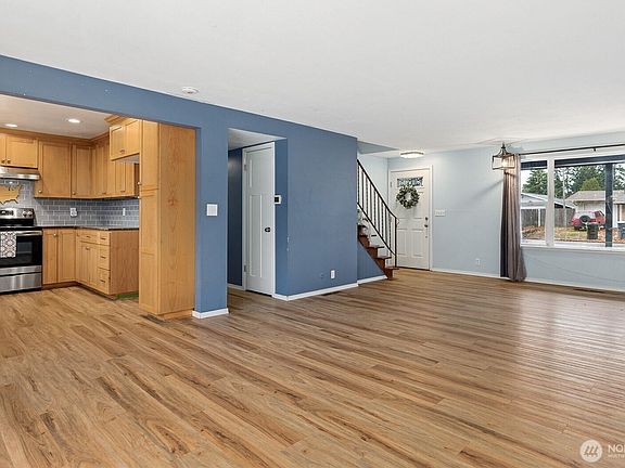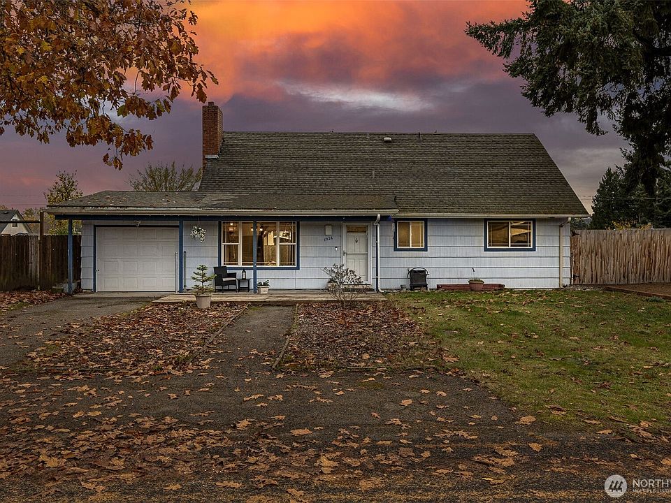 Charming and well-maintained 4-bedroom two-story home with thoughtful updates and a spacious layout. The remodeled kitchen features granite counters and stylish cabinetry. Vinyl plank flooring on the main level and carpet upstairs offer comfort and durability. The main-floor primary bedroom adds convenience, while upstairs includes two bedrooms and a fully remodeled full bath. Outside, enjoy a big back yard with a gazebo, perfect for gatherings alongside a fully fenced yard, a storage shed, a double-car detached garage, and a gated entry. With ample storage and parking, this property offers a warm and functional place to call home. Conveniently located near parks, trails, and outdoor recreation, and just an hour from Mt. Rainier.