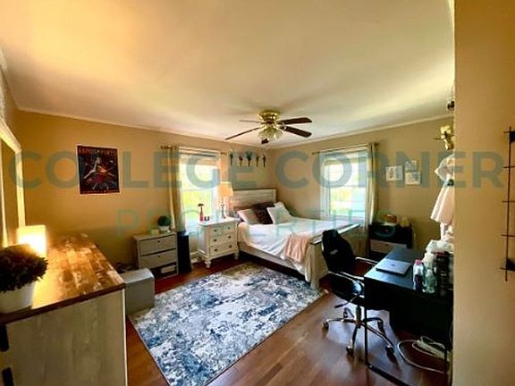There is a dedicated laundry room off the enclosed back porch, which provides access to the backyard and also includes a study counter. One bathroom is attached to a bedroom, while the other bathroom is a hallway bathroom shared between two bedrooms. The home comes fully furnished with a TV, sofa, chairs, and a dining table.