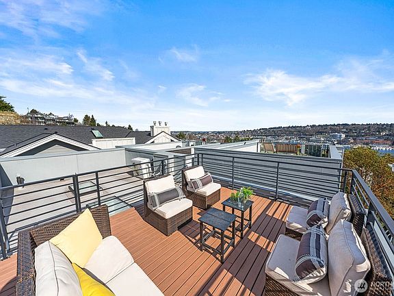 Welcome to this modern retreat with stunning city and Cascade views from the spacious roof deck. Across the street from Bye Kracke Park, you’re a short stroll past one of Seattle’s best viewpoints to Upper Queen Anne’s fantastic shops and restaurants. High ceilings, skylights and a wall of south-facing windows bring in stunning natural light. Enjoy big-screen movies or gaming nights in the perfectly situated rec room. Bedroom suite with walk-in closet and ensuite bath, plus a generous second bedroom/bath. A shared courtyard between neighbors is great for gathering (and ping pong!) Your spot in the secure parking garage is complete with EV charger and space for bikes as well. An easy walk to Meta (6 min), Amazon HQ (20 min) and downtown.
