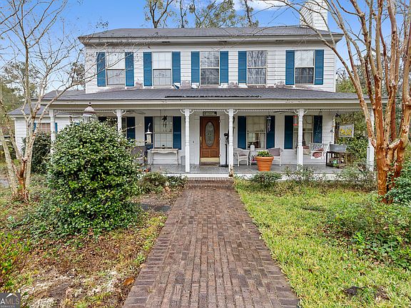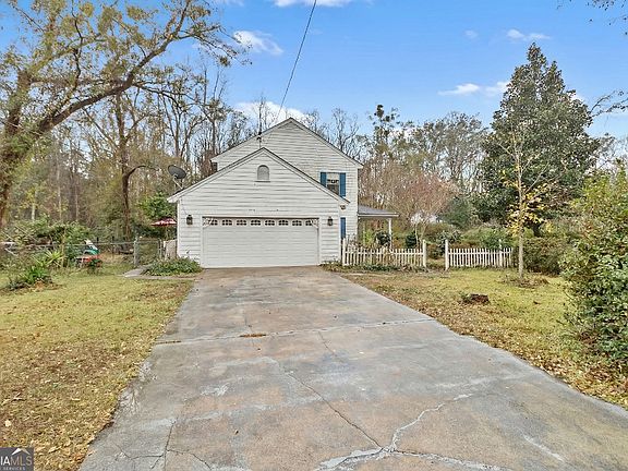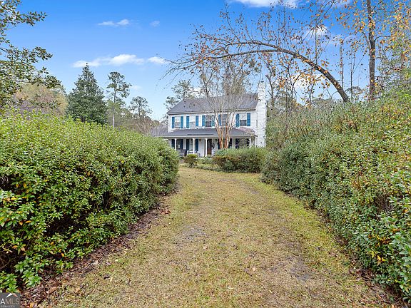 Tucked beneath a beautiful canopy of mature trees, this 2.76-acre property offers a rare blend of privacy, space, and convenience just minutes from Hinesville. While close to shopping and dining, the setting feels worlds away, with blooming azaleas and a peaceful, country atmosphere. Relax on the charming front porch or take advantage of the side-entry garage and double-gated parking area, perfect for a boat, RV, or work truck, with the possibility of horses pending county approval. Inside, the home is thoughtfully laid out with a dedicated front office, a warm great room featuring a true wood-burning fireplace, formal dining room, breakfast area, kitchen, and separate laundry room. All bedrooms and two full baths are located upstairs. A detached workshop with power offers ample storage and an upstairs loft. Additional features include two attics, a private well, no HOA restrictions, and no required flood insurance-making this property as practical as it is special.