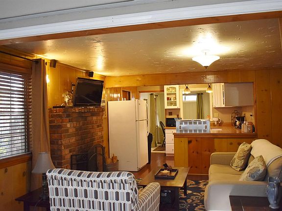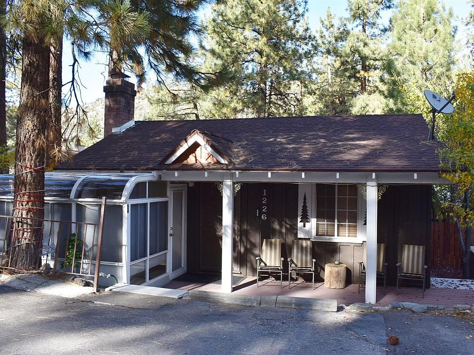 Charming Wrightwood Cabin with a cover front porch. This one story, 3 bedroom, 2 bath home has an open floor plan. Enter through the front solarium sun room which adds extra living space. Living room is open to the kitchen with a brick fireplace, wood flooring & recess lighting. Kitchen has new appliances and refrigerator is included. Utility porch is attached for great storage. Dining area has new tile flooring. Really looks nice! Laundry area includes a three-quarter bath with a adjoining bedroom. Full bath had a jet tub and has been updated with new tile, lighting and Vanity. Bedrooms are a nice size and provides plenty of space for family and guests. Back yard has a large Storage shed attached to back of home. Electrical sub panel has been updated, newer roof and new subfloor installation. Home is walking distance to town and easy access to Highway Two. This is a great cabin and must see!