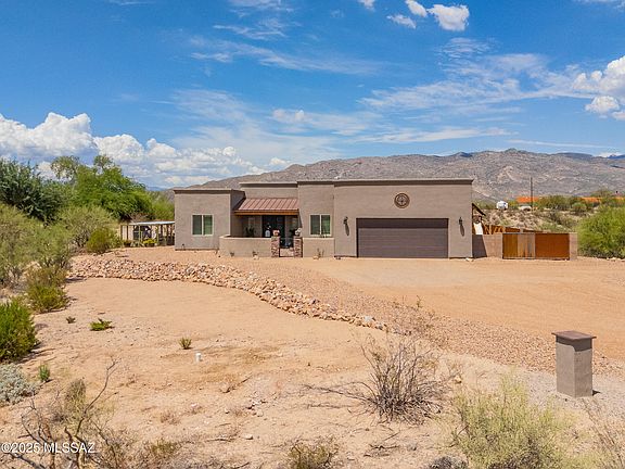 Stunning 2023 custom 3 bed, 2 bath + den home on nearly 5 acres with breathtaking views of Rincon Valley and Saguaro National Monument East. A welcoming courtyard entry leads into a bright, open split-bedroom floorplan with high ceilings and designer finishes throughout. Oversized, air-conditioned 2-car garage is perfect for projects or storage. No HOA--bring your RVs, trailers, horses, and toys! Enjoy a landscaped yard with artificial turf, kids' play area, and a full-length covered patio. Enjoy the peace of a beautiful rural setting where you feel worlds away from the hustle and bustle--yet you're just minutes from the conveniences of town and great schools. The perfect blend of privacy and accessibility. Endless potential to expand on this private Rocking K property.