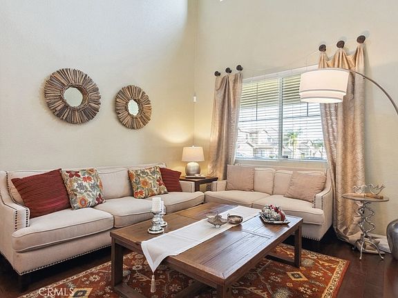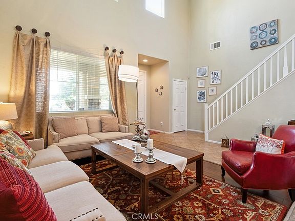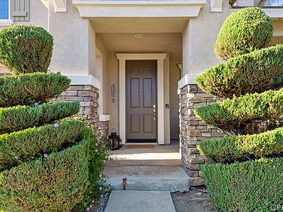 Beautiful Rancho Cucamonga 4 bed, 2.5 bath home with the interior offering 24-foot ceilings, elegant crown moulding, stylish 24-inch diagonal tile and hardwood floors in the main living areas. Before entering the home, enjoy the great curb appeal with the covered front porch and the landscaping. As you enter the home, you are greeted with the formal living room and dining room; a perfect space for entertaining guests! The upgraded kitchen includes white cabinetry, gorgeous granite counters, and new stainless steel appliances with gas cooktop, built-in oven, microwave, dishwasher, and refrigerator. The great room is perfect for relaxing with its custom stacked stone fireplace, built-in media niche, and surround sound system. A half bathroom and a laundry room complete the main floor. All of the bedrooms are located on the 2nd floor including the primary suite with 2 walk-in closets, and a private balcony! The primary bathroom offers dual sinks, a soaking tub, and a separate shower. The 3 secondary bedrooms are generously sized, and share a full-size hall bathroom. Step outside to your own private backyard oasis, with no rear neighbors, and enjoy a custom seating area with a built-in fire pit, a planter area, and a side yard grass area with lighting. This home also has an attached 3-Car tandem garage, is ideally located near the 210 Fwy, and is just 5 minutes from Victoria Gardens, with many shopping and dining options. Plus NO HOA fees! This is a truly must-see home!