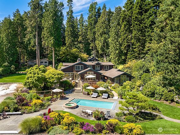 Architectural Masterpiece nestled on 380+- feet of white sand, Manzanita Bay shoreline. Luxury Island living with a deep water dock, inviting pool and spa set on 1.5+ parklike acres - two tax parcels and caretaker's cottage - w/mature evergreens, lawns and colorful gardens. Quality craftsmanship with vaulted ceilings and white oak floors grace relaxing light filled spaces designed for indoor/outdoor living with French doors to water view decks. Two elevators, two staircases tie the main floor primary suite, chef's kitchen, library, living, dining and breakfast rooms to the upper level fitness room, den, study, family room and guest suites. Amenities include a wine cellar, generator and biometric security sys. An exceptional island retreat!