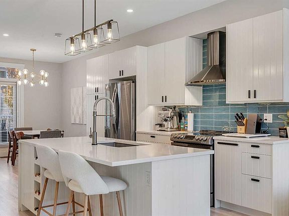Open-concept layoutWest-facing patioStainless steel appliancesBold blue tile backsplashQuartz countertopsGenerous islandVaulted ceilings