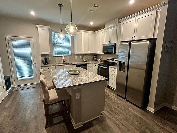 Bright open floor planStainless steel appliancesModern finishesConvenient breakfast barGenerous spaceSleek cabinetryCeiling fans
