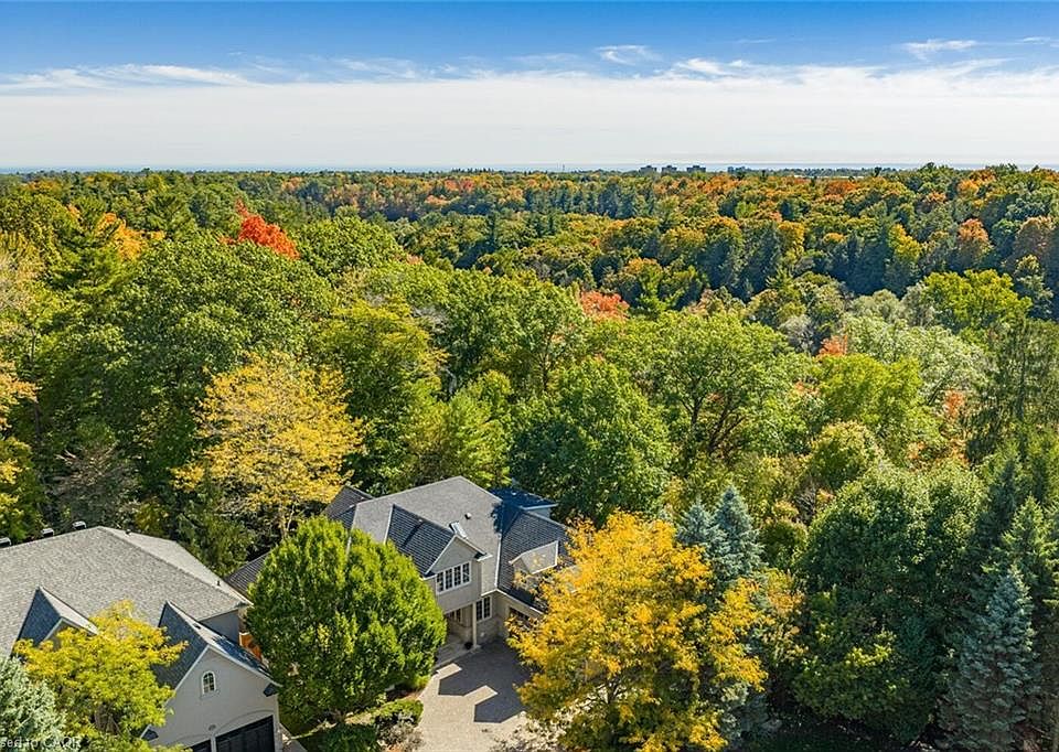 Architectural Masterpiece in Oakville - Muskoka Living on the Ravine! Welcome to the exclusive enclave of Riverbank Way, where bespoke homes overlook lush wooded ravines & back onto Sixteen Mile Creek Conservation. At the very end of this quiet cul-de-sac, the trail ends & tranquil home life begins.This custom-built 6,160 sq. ft. residence blends elegance, functionality & luxury. Sun-filled interiors are framed by picturesque forest views through expansive custom windows w/transoms. Grand living room w/soaring 16' high open-beam ceilings & gas FP forms the heart of this home. Entertain in the dining room designed for 12 guests. Enjoy Downsview kitchen featuring granite counters, marble backsplash, centre island w/2nd sink w/filtered water, gas stove, LED pot lights, B/I speakers & walk-in pantry. The breakfast room opens to a composite deck with glass railings, perfect for morning coffee, or glass of wine. The main floor primary suite boasts 10' high vaulted ceilings, FP, W/O to the deck, W/I closet & spa-inspired bath w/5-jet Jacuzzi, separate shower & stained-glass window. Convenient main floor laundry, inside garage entry & private staircase 2 LL complete this floor. Upstairs are 2 spacious bedrooms & a skylit bath. The walk-out lower level offers a separate entrance, billiards room, media room, office, 4th bedroom, large family room ideal for entertaining or multi-generational living. Granite rocks, multitier patios, lawn, stone benches in the amazing backyard. Dutch clean home. Updates: roof shingles (2018), 2nd floor hardwood (2018), finished lower-level rms (2018), furnace & AC (2023), epoxy garage flrs (2023).Lifestyle perks: miles of interconnected trails@thr doorstep, nearby Lions Valley with red cliffs, hospital, Health Science Village, new Regional Courthouse, 16 Mile Sports Complex, library, community centre, shopping, dining access Hwy 407, QEW&GO Train. The epitome of sophistication & elegance, set in Oakville's most breathtaking natural landscape.