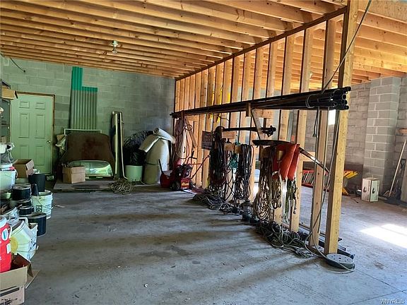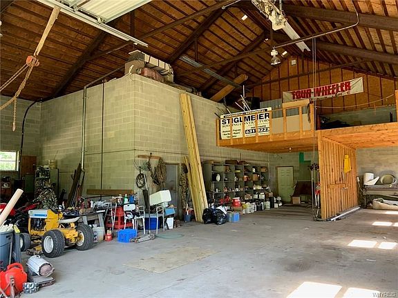 Beautiful private setting, 1.5 acres backing up to Ive Ridge golf course, in sought after Clarence school district. Tremendous brick building offering of approx 4000sf, with 2400sf of two story open space ideal for shop, artist studio, auto storage, contractor home base. Oversized 16' garage door plus add'l bay, floored storage on upper level. Adjacent 2BR apartment of 1480sf features knotty pine, brick WBFP, galley kitchen, access to fenced in yard. Two large BRs, 2nd story deck, 1st floor laundry. A/C, newer roof. Exceptional opportunity to command appreciable space in a rock solid building, in a beautiful country setting. 2019-10-07